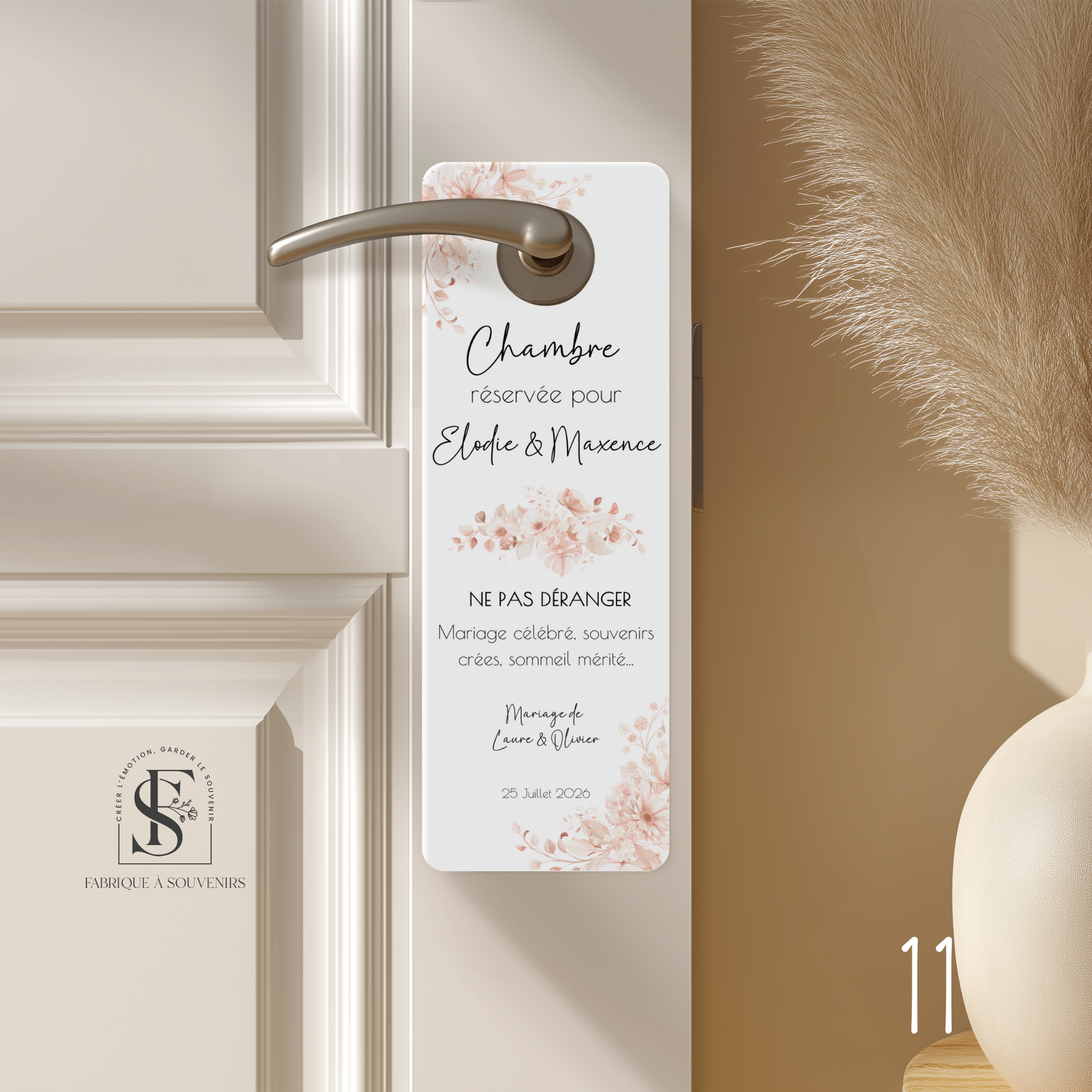 Ajoutez une touche unique et raffinée à votre mariage avec cet accroche porte personnalisé, parfait pour accueillir vos invités dans leur chambre. Idéale pour les mariages en gîte, ou en domaine, il permet de créer une ambiance chaleureuse et attentionnée jusque dans les moindres détails