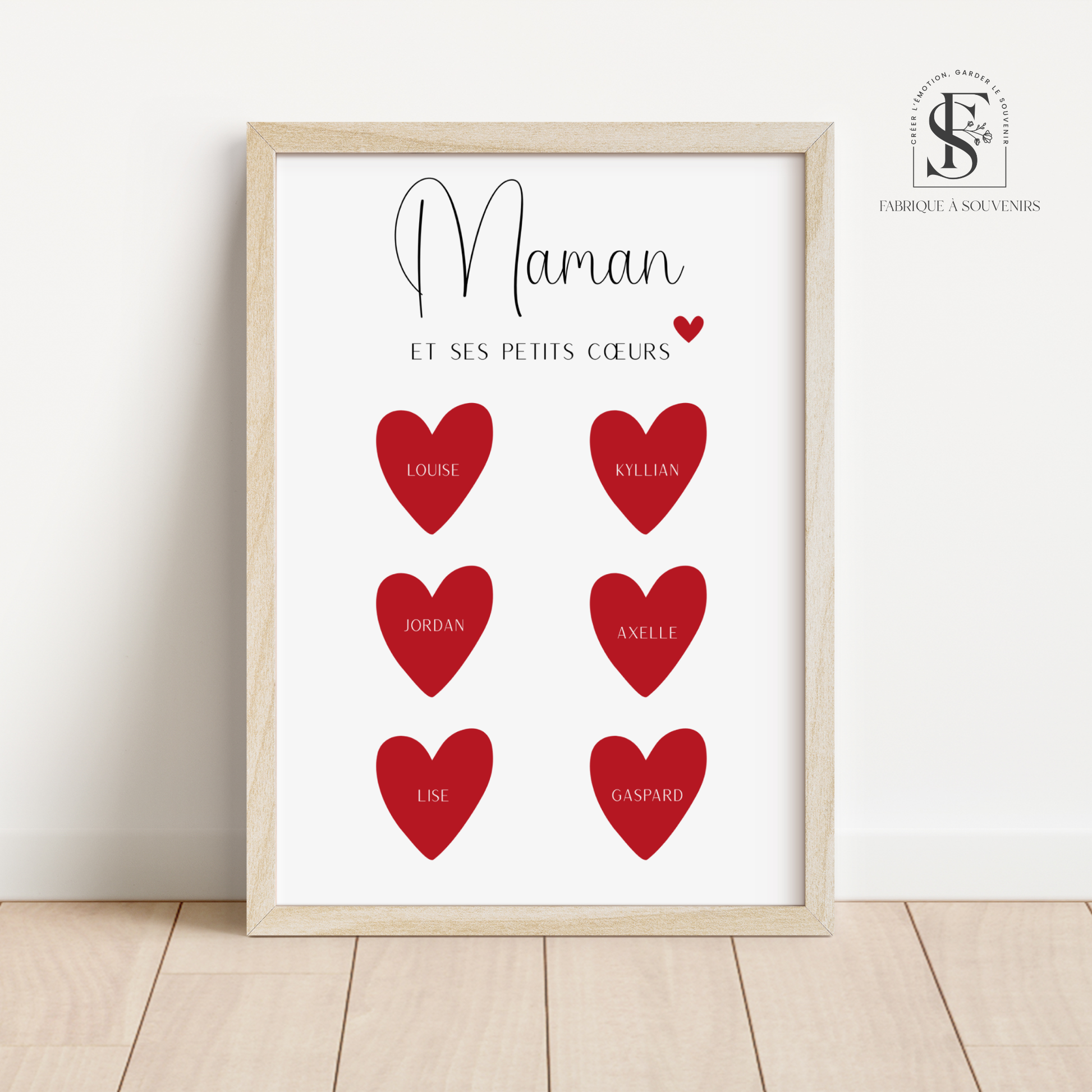 Offrez à votre Maman une affiche remplie d'amour & d'émotion. Chaque cœur représente un petit-enfant, avec son prénom délicatement inscrit, illustrant le lien unique et précieux qui les unité.
