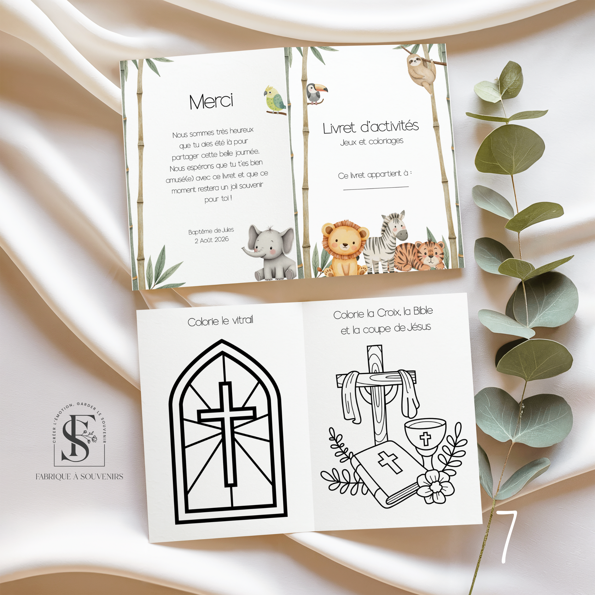 Offrez aux petits invités un moment de jeu et de créativité pendant le baptême avec ce livret d'activités ludiques et personnalisées ! Conçu spécialement pour occuper les enfants de manière amusante et calme, ce livret comprend 6 pages de 10 activités, il est le compagnon idéal pour une journée mémorable.