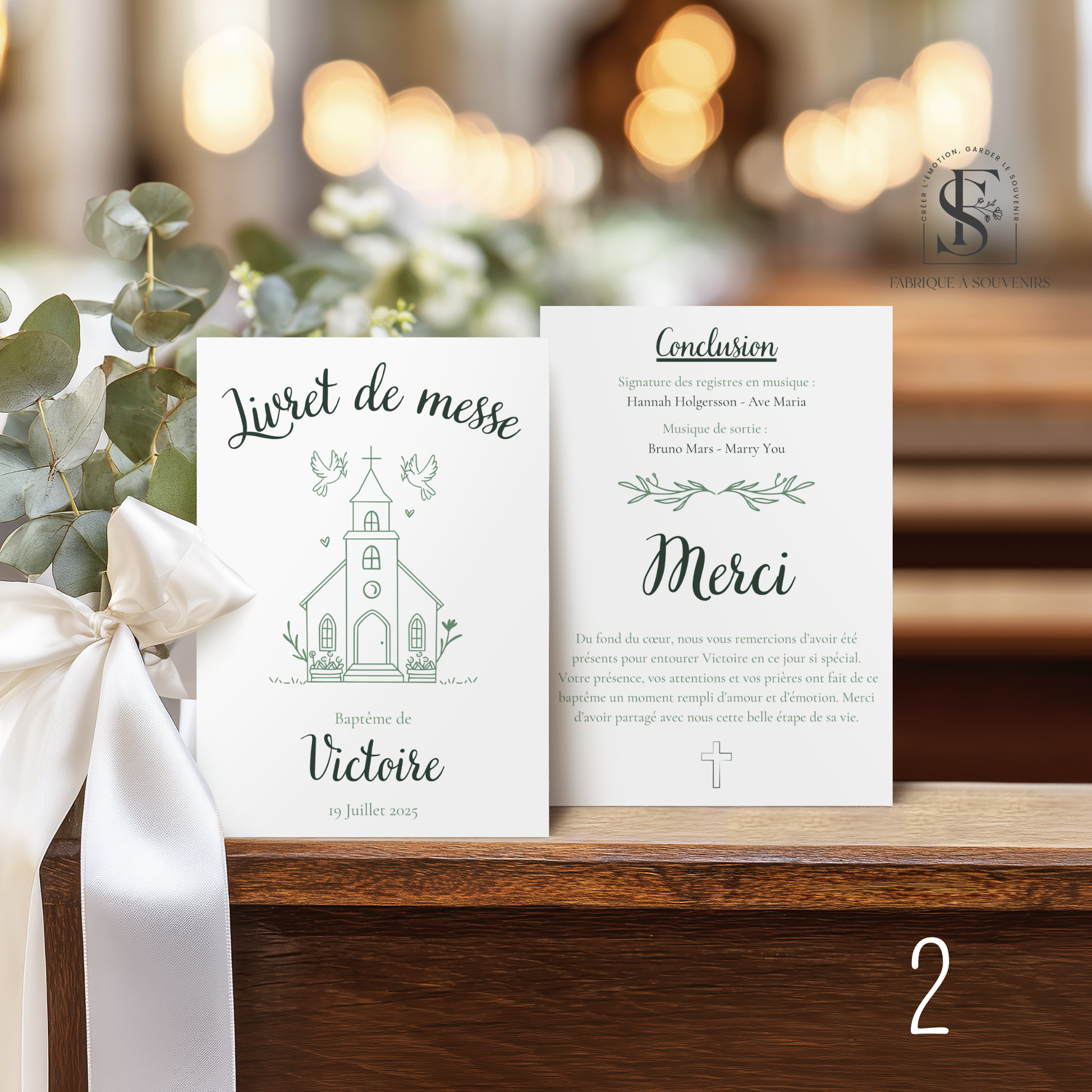 Offrez à vos invités un souvenir unique et précieux de votre cérémonie avec notre livret de messe personnalisé, il accompagne votre cérémonie avec émotion et raffinement. Conçu à votre image, il rassemble les textes, chants et prières que vous avez choisis, dans une mise en page soignée.