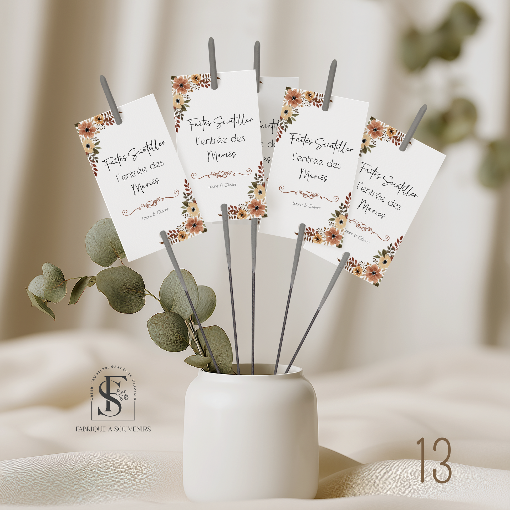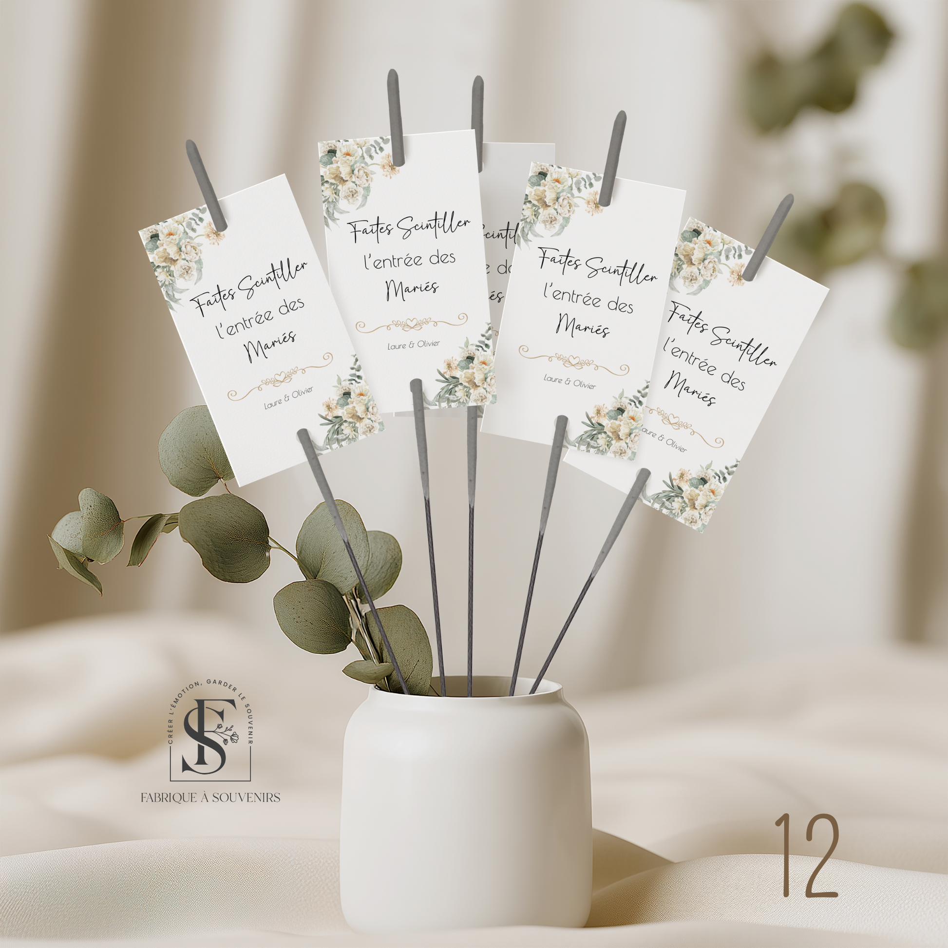 Ajoutez une touche personnalisée à votre mariage avec nos étiquettes pour cierges magiques. Parfaite pour sublimer l'entrée des mariés, l'ouverture de bal ou tout moment spécial de votre réception, elle apporteront une note unique & raffinée à votre décoration.